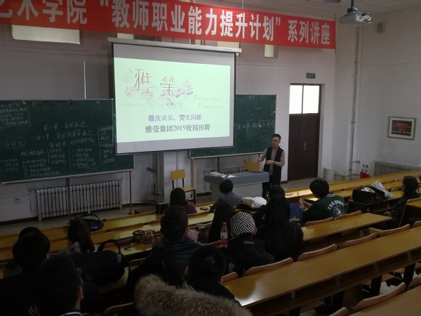 11月5日在戏剧与艺术公司1103教室,进行了雅莹集团东北区就业宣讲和招聘面试活动,参与人员有雅莹集团东北区总经理李国亮先生、区域经理徐秀影女士、HR经理张月女士,戏剧与艺术公司潘晓红副经理、涂淑梅副书记及专业内15、16级员工。